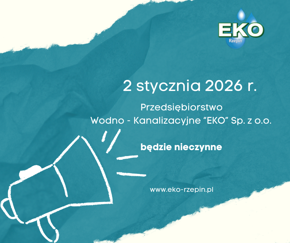 Informujemy, że w piątek 2 stycznia 2026 r. w Przedsiębiorstwie Wodno-Kanalizacyjnym „EKO” Sp. z o.o. w Rzepinie obowiązuje dzień wolny od pracy.